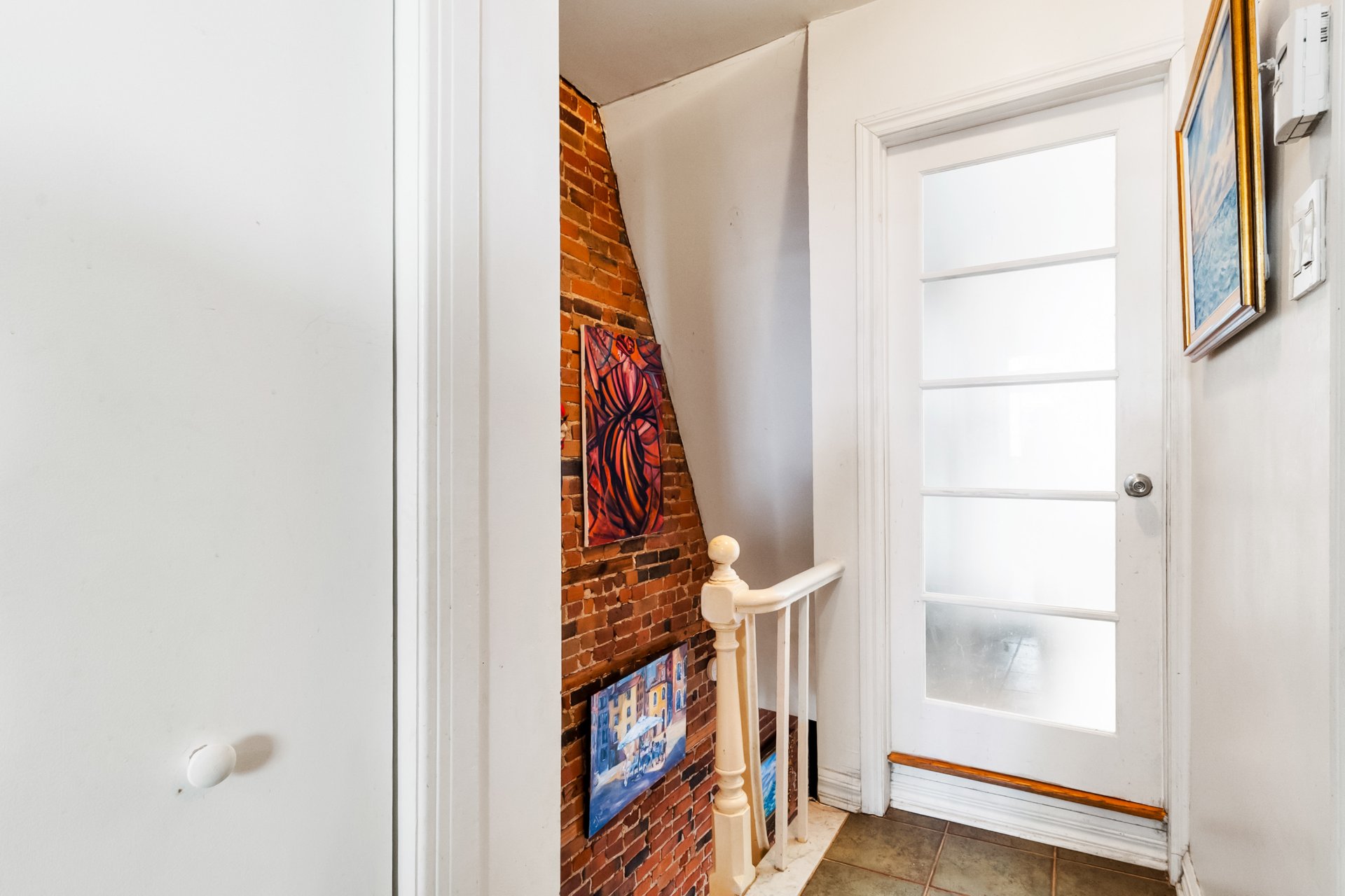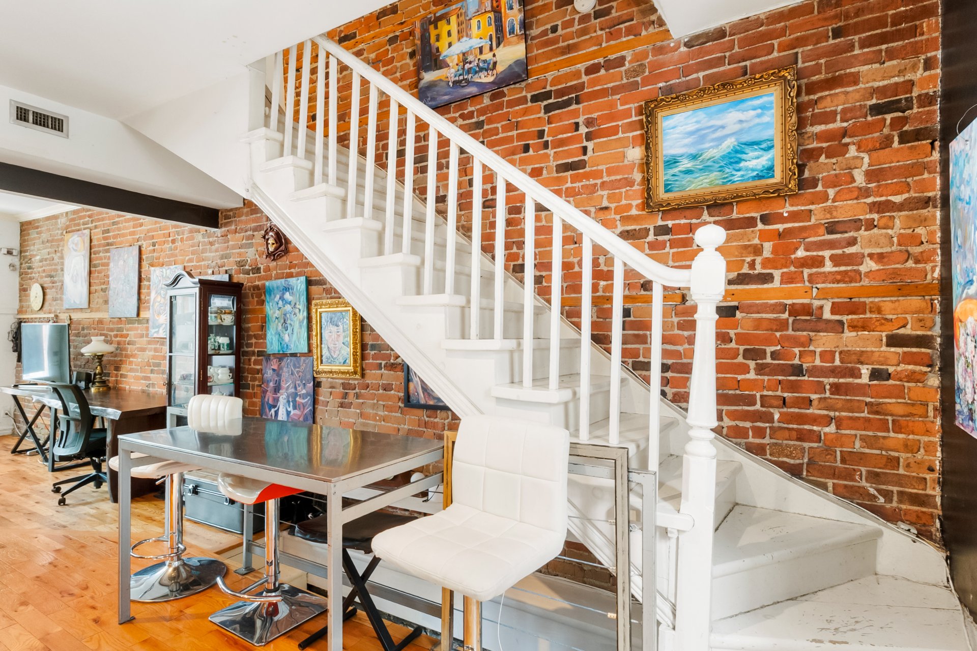conservés : escalier en bois, murs de briques apparentes et