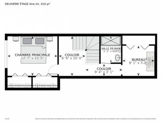 | Chambre à coucher principale | 12.9 x 13.3 P | 2ième étage | Bois |